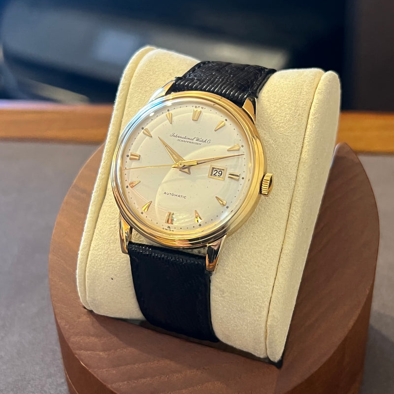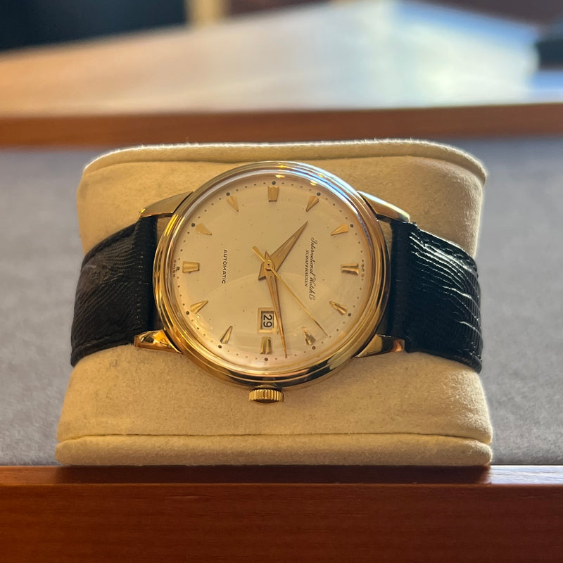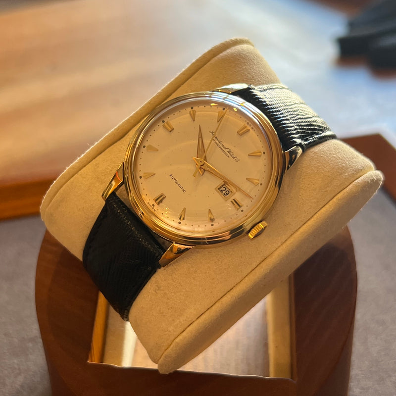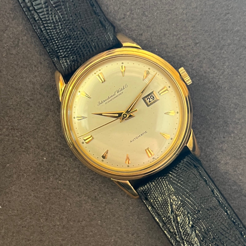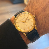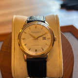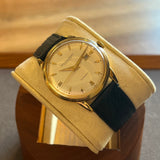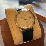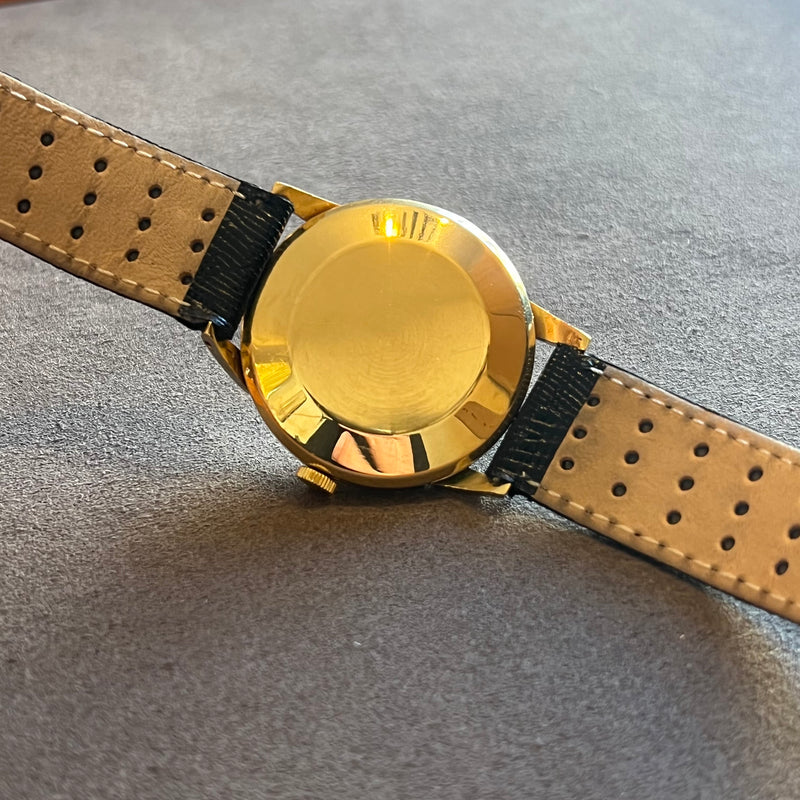 Yellow Gold case. Smooth gold bezel. White dial without numerals. Gold indices and hands. Plexiglass crystal. Automatic movement. Solid gold steel case back. Black replacement leather strap, non-original. Gold pin buckle.