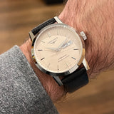 Diameter 40 mm. Stainless steel case. Smooth steel bezel. Beige dial without numerals. Luminous hands and markers. Sapphire crystal. Automatic movement. Caliber L897.2. Power reserve of 72 hours. Transparent case back with stickers. Replacement black leather strap non-original. Steel pin buckle with Longines emblem.