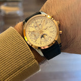 Functions: Hours, minutes, chronograph, moon phase at 6 o'clock, month and day display at 12 o'clock, date display.