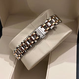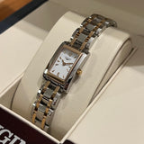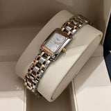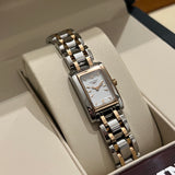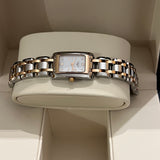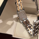 Dimensions 16 mm * 26 mm. Wrist size 16.2 cm. Case and bracelet in steel and rose gold. Smooth rose gold bezel. White dial with Arabic numerals. Gold hands and indices. Sapphire crystal. Quartz movement. Solid steel case back with Longines emblem. Double folding clasp in steel with Longines emblem.