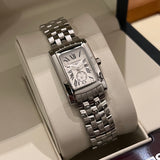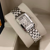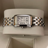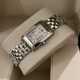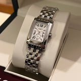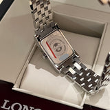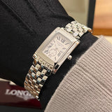 Dimensions 20 mm * 30 mm. Wrist size 17 cm. Case and bracelet in stainless steel. Smooth steel bezel. Silver dial with Roman numerals. Sapphire crystal. Quartz movement. Solid steel case back with stickers. Double folding clasp in steel with Longines emblem.