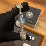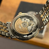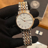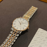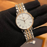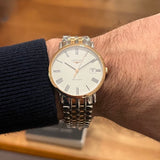 Dimensions: 37 mm diameter. Thickness: 9 mm. Water-resistant up to 30 meters. Sapphire crystal. White dial with Roman numerals. Stainless steel case. Rose gold bezel. Stainless steel and rose gold bracelet.