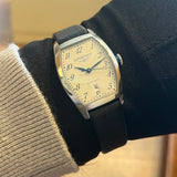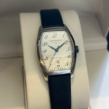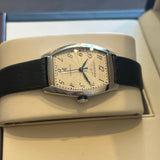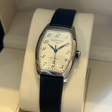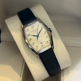 Diameter 26mm* 30.60mm. Stainless steel case. Smooth stainless steel bezel. Longines crown. Silver guilloché dial with Arabic numerals. Blued hands. Sapphire crystal. Automatic movement. Solid stainless steel case back with Longines emblem. Replacement off-brand black leather strap. Longines pin buckle.