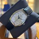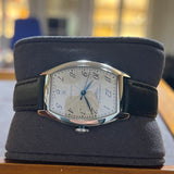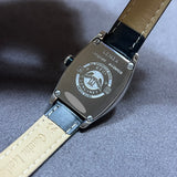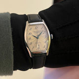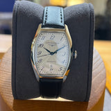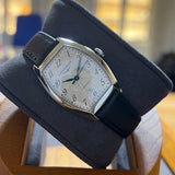 Diameter 26mm*36mm. Stainless steel case. Smooth steel bezel. Longines crown. Silver guilloché dial with Arabic numerals. Blued hands. Sapphire crystal. Automatic movement. Solid stainless steel caseback with Longines emblem. Black replacement off-brand leather strap. Stainless steel double folding clasp with Longines emblem.