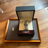 Diameter 36 mm. Wrist size 15.3 cm without the additional links. Stainless steel case and bracelet. Smooth steel bezel. Black dial without numerals. Quartz movement. Solid case back with original Longines sticker. Double deployant clasp with Longines emblem.