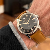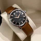 Diameter 35 mm. Stainless steel case. Smooth stainless steel bezel. Black dial without numerals. Gold hands and markers. Sapphire crystal. Automatic movement. Solid stainless steel case back with Longines emblem. Brown leather replacement strap, not original Longines. Stainless steel pin buckle with Longines emblem.