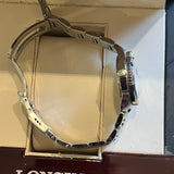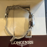 Diameter 29.50 mm. Wrist circumference 14.5 cm. Case and bracelet in stainless steel. Bezel set with diamonds. Mother-of-pearl dial. Diamond-set indices. Sapphire crystal. Quartz movement. Full stainless steel case back with Longines emblem. Stainless steel deployant clasp with Longines emblem.