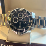 Diameter 41 mm. Thickness 12 mm. Stainless steel housing. Black dial. Needles and luminescent points. Unidirectional rotating aluminum bezel. Glass sapphire. Automatic chronograph movement with 42 hours of power reserve. Caliber L667.2. Steel bracelet. Steel deployed buckle with Longines emblem. Crown with Longines emblem. Solid screwed case back with Longines emblem.