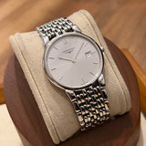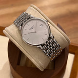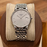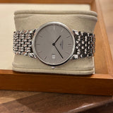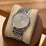 Diameter 34 mm. Wrist circumference 17.2 cm. Case and bracelet in stainless steel. Smooth steel bezel. Silver dial with Roman numerals at 12 o'clock. Sapphire crystal. Quartz movement. Solid steel case back with Longines emblem. Sliding deployant clasp in steel with Longines emblem.