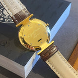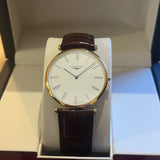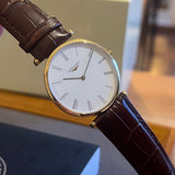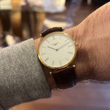Diameter 36 mm. Between lugs 20 mm. Thickness 5.20 mm. Steel case. Yellow Gold PVD. Quartz movement L420. White dial with Roman numerals. Black hands. Sapphire crystal. Solid caseback. Waterproof 30 meters. New non-original replacement brown leather strap. Original Longines pin buckle.