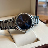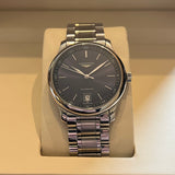 Diameter 38.5 mm. Wrist circumference of 16.8 cm without additional links. Stainless steel case and bracelet. Smooth steel bezel. Longines crown. Blue dial without numerals. Sapphire crystal. Automatic movement. Transparent case back. Stainless steel double folding clasp with Longines emblem.