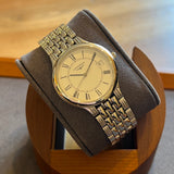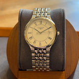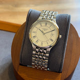 Diameter 34 mm. Wrist circumference of 19.5 cm. Stainless steel case and bracelet. Smooth steel bezel. White dial with Roman numerals. Sapphire crystal. Quartz movement. Solid steel case back with Longines emblem. Stainless steel folding clasp with Longines emblem.