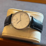 Diameter 33 mm. Between lugs 18 mm. Thickness 6 mm. Stainless steel housing. Quartz movement. White dial with stick indexes. Sapphire crystal. Solid caseback. Waterproof 30 meters. New non-original replacement black leather strap. Original Longines pin buckle.
