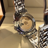 Diameter 39 mm. Wrist size 18.6 cm without the 2 additional links. Case and bracelet in stainless steel. Smooth steel bezel. Black dial with Arabic numerals at 12 o’clock. Luminous hands and markers. Sapphire crystal. Automatic movement. Transparent case back. Double folding clasp in steel with Longines emblem.