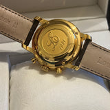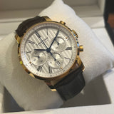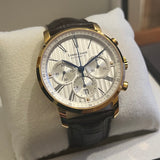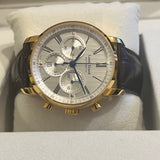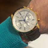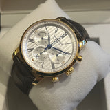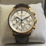 Diameter 42 mm. Gold-plated steel case. Smooth gold-plated steel bezel. Silver dial with Roman numerals. Blued hands. Sapphire crystal. Automatic movement. Caliber ETA 7753. Solid gold-plated steel case back with Louis Erard emblem. Original black leather strap by Louis Erard. Double folding clasp in steel with Louis Erard emblem.