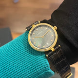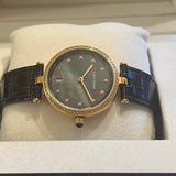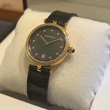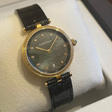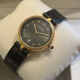 Diameter 33 mm. Gold-tone steel case. Bezel set with natural diamonds. Mother of pearl dial. Indices set with natural diamonds. Sapphire crystal. Quartz movement. Solid gold-tone steel case back with Louis Erard emblem. Original Louis Erard black leather strap. Gold-tone steel double-folding clasp with Louis Erard emblem.