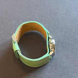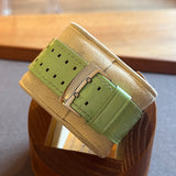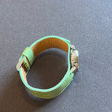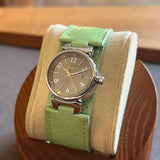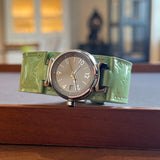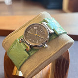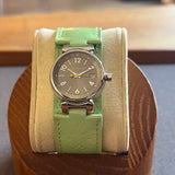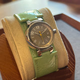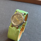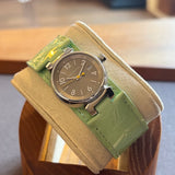Diameter 28 mm. Stainless steel case engraved with Louis Vuitton. Brown dial with Roman numerals. Sapphire crystal. Quartz movement. Solid case back. Green leather strap with Louis Vuitton monogram. Steel pin buckle with Louis Vuitton emblem.