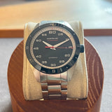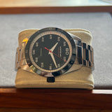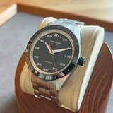 Diameter 41 mm. Wrist size 17.9 cm. Case and bracelet in stainless steel. Black steel bezel. Black dial with Arabic numerals. Luminous hands. Sapphire crystal. Automatic movement. Caliber MB 2417. Transparent case back. Double folding steel clasp.