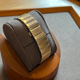 Diameter 34 mm. Wrist circumference 17.5 cm. Case and bracelet in stainless steel. 18kt yellow gold bezel. Omega crown. Black dial without numerals. Gold hands and indexes. Sapphire crystal. Quartz movement. Solid stainless steel case back. Sliding deployant clasp with Omega emblem.