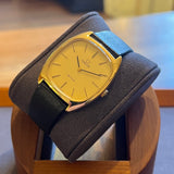 Diameter 32 mm * 38 mm. Gold-plated steel case. Smooth gold-plated steel bezel. Omega crown. Champagne dial without numerals. Mechanical movement. Solid steel case back. Original black leather Omega strap. Omega gold-plated steel pin buckle.
