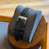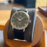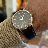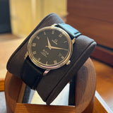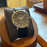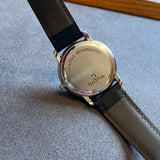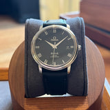 Diameter 36.5 mm. Stainless steel case. Smooth steel bezel. Black dial with Roman numerals. Sapphire crystal. Automatic movement. Caliber 2500. 48-hour power reserve. Solid steel case back with Omega emblem. Black leather off-brand strap. Steel pin buckle with Omega emblem.