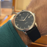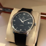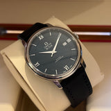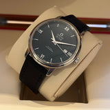 Diameter 39.5 mm. Stainless steel case. Smooth steel bezel. Omega crown. Blue dial with Roman numerals. Sapphire crystal. Automatic movement. Caliber 2500. Solid steel caseback with Omega emblem. Replacement black leather strap, off-brand. Omega pin buckle.