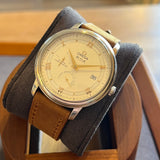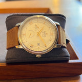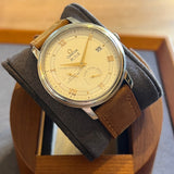 Diameter 39.5 mm. Stainless steel case. Smooth steel bezel. Silver dial with Roman numerals. Gold-tone hands and indexes. Sapphire crystal. Automatic movement. Caliber 2627. Solid steel case back with Omega emblem. Brown replacement leather strap (off-brand). Steel pin buckle with Omega emblem.
