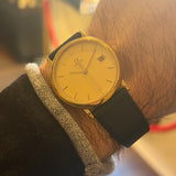Diameter 32 mm. Gold-plated steel case. Smooth gold-plated steel bezel. Champagne dial without numerals. Quartz movement. Solid steel case back with Omega emblem. Replacement black leather strap, not original. Gold-plated steel pin buckle with Omega emblem.
