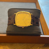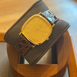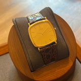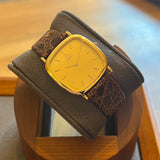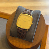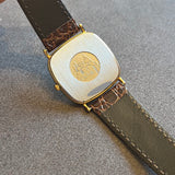 Diameter: 30 mm * 35 mm. Gold-plated steel case. Smooth gold-plated steel bezel. Omega crown. Champagne dial without numerals. Quartz movement. Brown off-brand leather strap. Gold-plated steel pin buckle with Omega emblem.