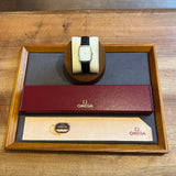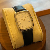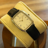 Dimensions: 31 mm * 26 mm. Stainless steel case. Smooth gold-plated steel bezel. White dial with Roman numerals. Gold hands. Quartz movement. Solid steel case back with Omega emblem. Replacement black leather strap. Steel pin buckle with Omega emblem.