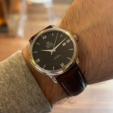 Diameter 39.5 mm. Thickness 9.8 mm. Lug width 20 mm. Stainless steel case. Black dial with Roman numerals. Curved sapphire crystal. Automatic movement. Omega caliber 2500. Power reserve of 48 hours. Brown leather bracelet not original replacement. Full case back with original sticker. Pin buckle with Omega emblem.