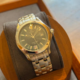 Diameter 34 mm. Wrist size 17.5 cm. Case and bracelet in stainless steel. Smooth steel bezel. Omega crown. Blue dial without numerals. Sapphire crystal. Quartz movement. Solid steel caseback with Omega emblem. Stainless steel deployant clasp with Omega emblem.