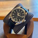 Diameter 38.5 mm. Thickness 11.9 mm. Stainless steel case. Smooth steel bezel. Textured gray dial without numerals. Luminous hands and indexes. Sapphire crystal. Quartz movement. Solid steel case back with Omega emblem. Replacement black leather strap, non-original Omega. Replacement steel pin buckle, non-original Omega.