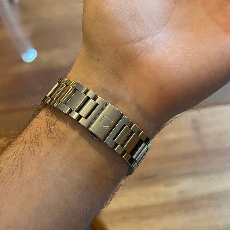 Diameter 38.5 mm. Stainless steel case and bracelet. Smooth steel bezel. Grey dial without numbers. Luminous hands and indices. Sapphire crystal. Quartz movement. Omega caliber 1538. Solid case back with Omega emblem. Double folding clasp with Omega emblem.