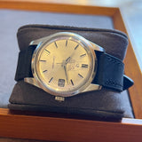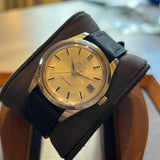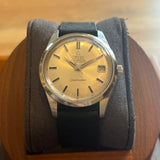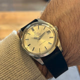 Diameter 35 mm. Stainless steel case. Smooth stainless steel bezel. Omega crown. Silver dial without numerals. Plexiglass crystal. Automatic movement. Solid stainless steel case back with Omega emblem. Replacement off-brand black leather strap. Omega pin buckle.