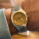 Diameter 36 mm. Wrist size 16.6 cm. Case and bracelet in stainless steel. Bezel in yellow gold. Champagne dial without numbers. Luminous hands and markers. Quartz movement. Steel case back with Omega emblem. Sliding deployant clasp in steel with Omega emblem.