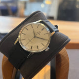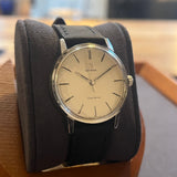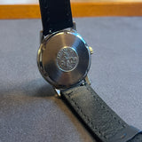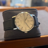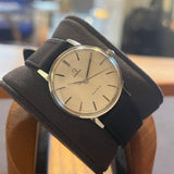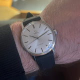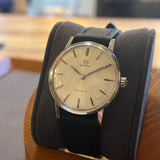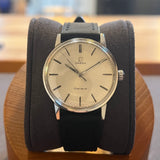 Stainless steel case. Smooth steel bezel. Omega crown. Silver dial. Plexiglass crystal. Mechanical hand-winding movement. Solid steel case back with Omega emblem. Replacement off-brand black leather strap. Replacement off-brand steel pin buckle.
