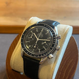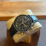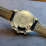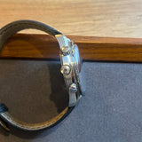 Diameter 39mm steel case. Hesalite glass. Non-original remplacement black leather strap. Original omega pin buckle. Black dial without numbers. Screwed solid case back.