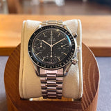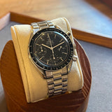 Diameter 39 mm. Thickness 12.3 mm. Between lugs 18 mm. Stainless steel case and bracelet. Black dial. Waterproof 50 meters. Plexiglass glass. Automatic movement caliber 1140. Power reserve of 42 hours. Number of stones 46. Solid caseback. Crown with Omega emblem. Original Omega clasp and bracelet. Fixed black bezel. Luminescent hands and indexes.