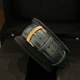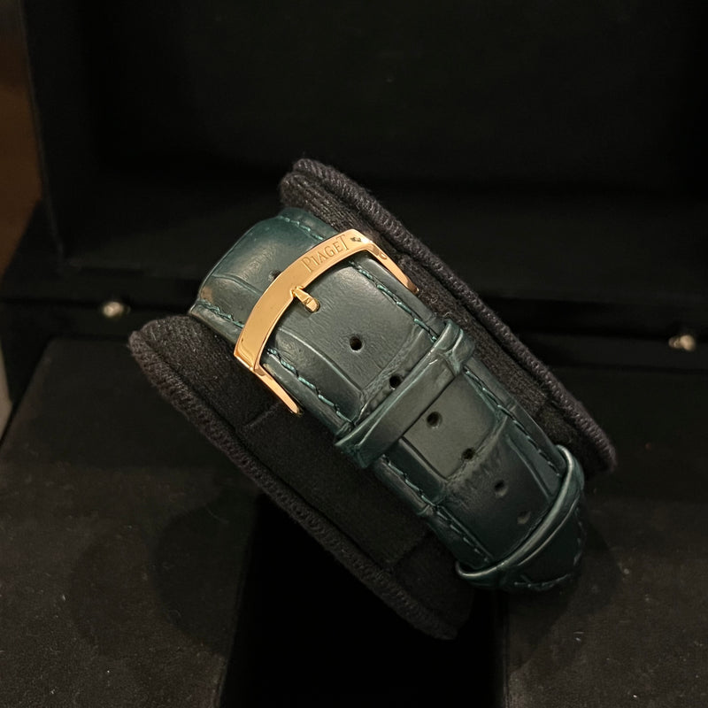 Diameter 43 mm. Thickness 5.25 mm. Case in 750 pink gold. Smooth bezel in 750 pink gold. White dial with no numerals. Sapphire crystal. Automatic movement. Caliber 1208P. Transparent case back. Replacement green leather strap (non-original). Pin buckle in 750 pink gold with Piaget emblem.