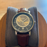 Diameter 33mm. Stainless steel case. Smooth steel bezel. Grey dial with diamonds, no numerals. Sapphire crystal. Quartz movement. Solid stainless steel case back with Rado emblem. Replacement brown leather strap, off-brand. Steel deployant clasp with Rado emblem.