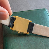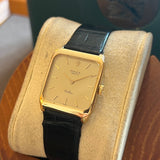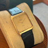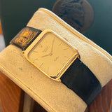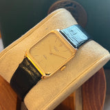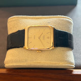 Diameter 26 mm. Case and pin buckle in 18 Kt yellow gold 27.2 g. Champagne dial without numerals. Gold hands and indices. Manual winding automatic movement. Solid steel case back. Replacement black leather strap not original.