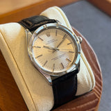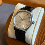 Diameter 34 mm. Stainless steel case. Stainless steel fluted bezel. Silver dial without numerals. Luminous hands and markers. Plexiglass crystal. Automatic movement. Caliber 1570. 48-hour power reserve. Solid stainless steel case back. Replacement black leather strap, non-original. Replacement stainless steel pin buckle, non-original.