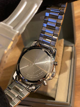 Dimensions: 39 mm diameter. Water-resistant up to 100 meters. Stainless steel case and bracelet. Quartz movement. Black dial. Functions: hours, minutes, small seconds, date, chronograph.