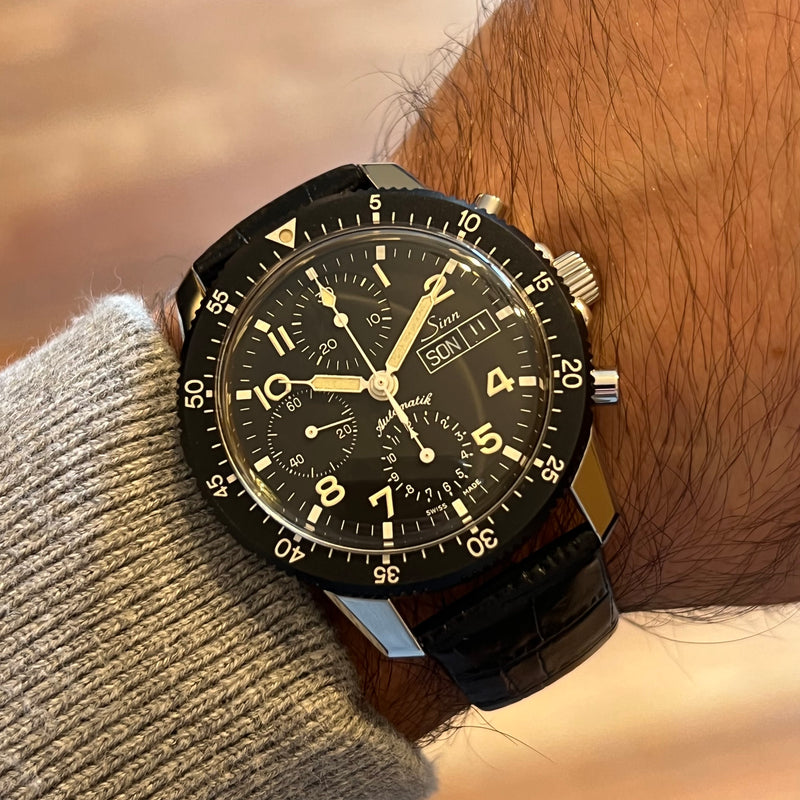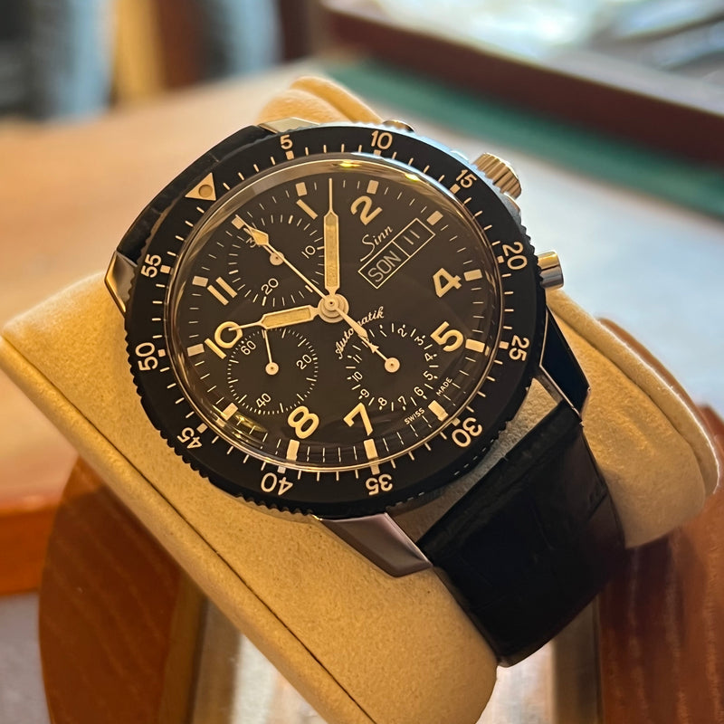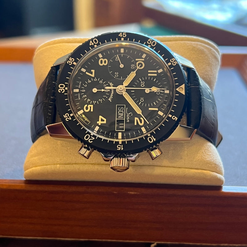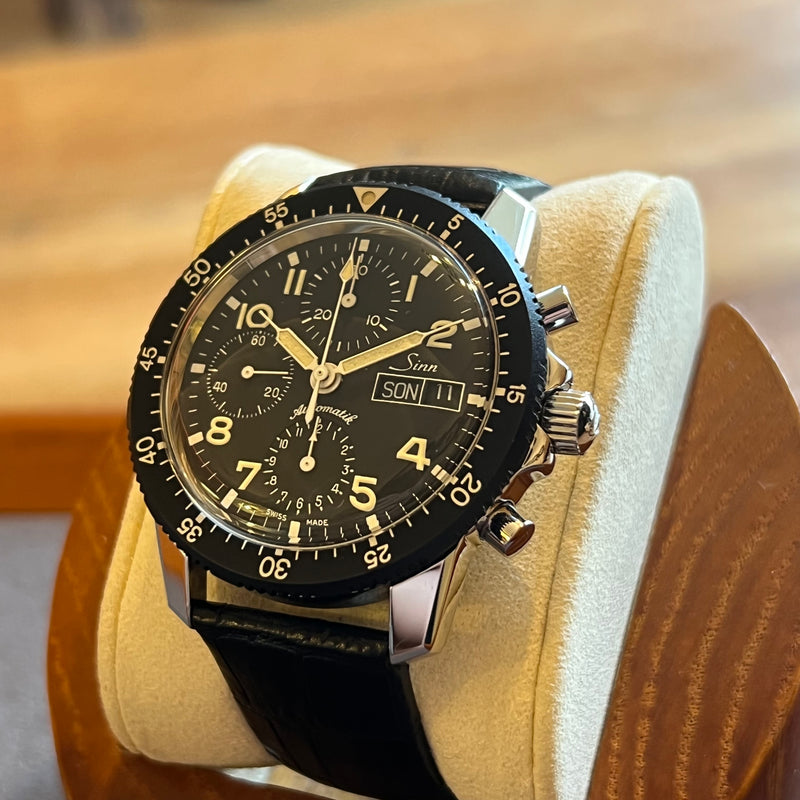 Diameter 41 mm. Stainless steel case. Black bezel with minute scale. Black dial with Arabic numerals. Luminous hands. Acrylic glass. Automatic chronograph movement. Solid steel case back with Sinn emblem. Replacement black leather strap, non-original. Steel pin buckle with Sinn emblem.