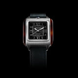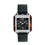 HMS Streamliner Kennedy automatic watch, 36x36 mm. Square brushed steel case with tortoise shell acetate sides. Crown at 12 o'clock with a lapis lazuli cabochon. Double-layer black dial, white subdial with hollowed-out Roman and Arabic numerals and central section with railroad minute track and guilloché motif decoration. Hours, Minutes, Seconds. Brushed steel "Dauphine" style hands with SuperLuminova® inserts. Ultra-resistant sapphire crystal. Exclusive Briston interchangeable 20 mm strap in matt black vintage leather. Ultra-thin Japanese Miyota 9039 automatic movement. Water resistant to 50 m/ 5 ATM.