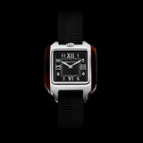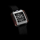 HM Streamliner Kennedy watch, 25x25 mm. Square polished steel case with tortoise shell acetate sides. Crown at 12 o'clock with a lapis lazuli cabochon. Black dial with white Roman and Arabic numerals, central section with railroad minute track and guilloché motif decoration. Hours and minutes. Polished steel "Dauphine" style hands with SuperLuminova® inserts. Curved, ultra-resistant mineral crystal:. Exclusive Briston interchangeable NATO strap (12 mm): black with steel buckle. Quartz caliber: Swiss Ronda Normtech 751. Water resistance 50 m/ 5 ATM.