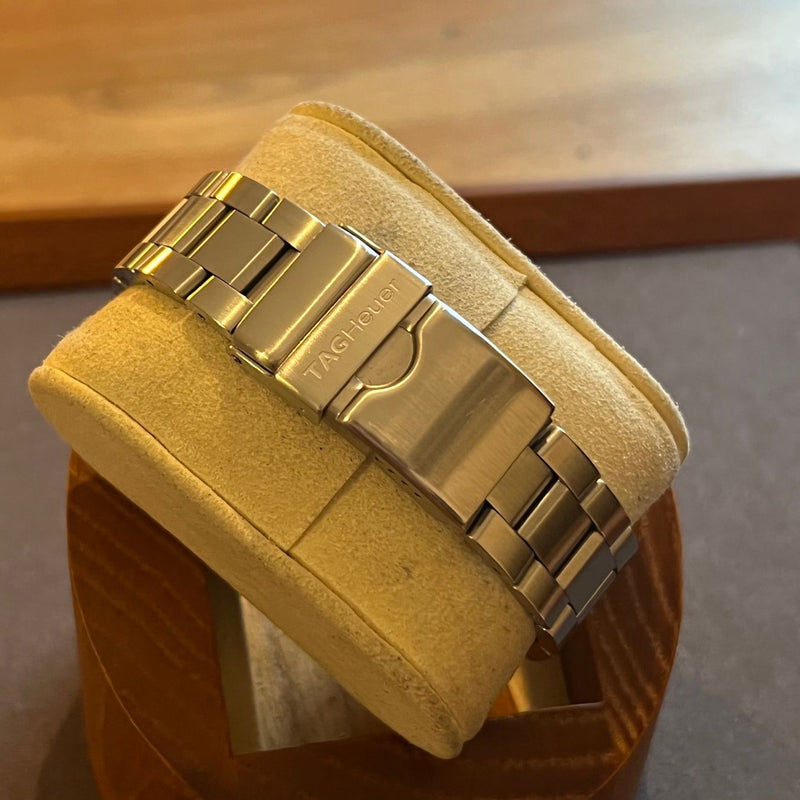 Diameter 41 mm. Stainless steel case and bracelet. Black dial with Roman numerals at 12 o'clock. Luminous hands and indices. Sapphire crystal. Quartz chronograph movement. Solid case back with Tag Heuer emblem. Stainless steel folding clasp with Tag Heuer emblem.