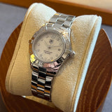 Diameter: 27 mm. Thickness: 9 mm. Case and bracelet: Stainless steel. Bezel stainless steel unidirectional rotating. Dial Mother of pearl with 10 diamond indexes of 0.07 carat. Hands luminous. Crystal Sapphire. Movement Quartz. Case back solid with Tag Heuer emblem. Deployant buckle stainless steel with Tag Heuer emblem.