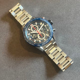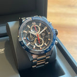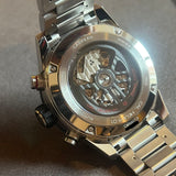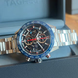 Diameter 43 mm. Waterproof 100 meters. Satin/polished stainless steel case and bracelet. Sapphire crystal. Fixed ceramic bezel. Skeleton dial. Heuer caliber 01 automatic movement with 50 hours of power reserve. Transparent caseback. Original Tag Heuer double folding clasp in steel. Crown with Tag Heuer emblem. Luminescent hands and indexes.
